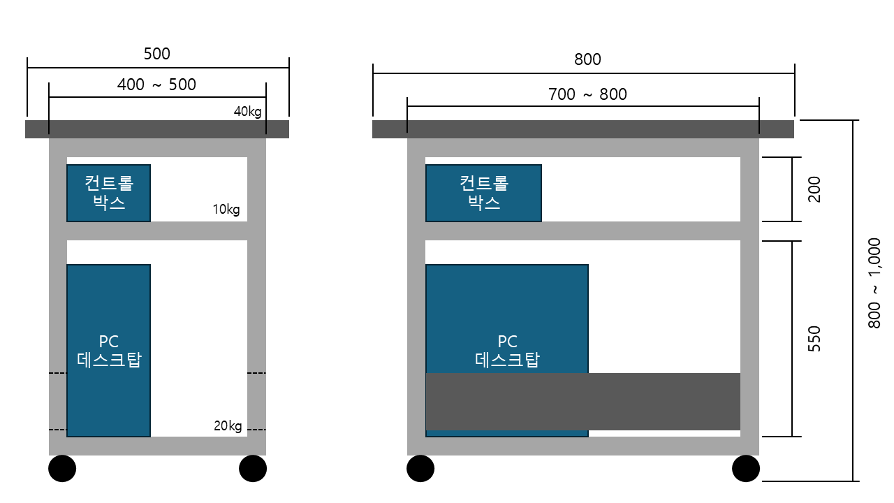| 안녕하세요. 주식회사 하우앳 연구원 이병일입니다. 장비 거치용 이동식 테이블 제작 문의 드리려고 합니다. 스펙 및 주요사항은 아래와 같으며 견적과 도면을 받을 수 있다면 메일로 보내주시면 감사하겠습니다. 혹 질문 사항이 있으시다면 연락 부탁드립니다. 감사합니다. 1. 기본 사양 - 형태: 이동식 3단 테이블 - 전체 높이: 800 ~ 1,000mm 예상 - 상판 크기: 가로 500mm × 세로 800mm - 허용 하중: 최소 60kg · 실제 거치 장비 무게: 약 40kg 이하 · 기타 부품, PC 등 2. 단 구성 - 1층(하판): 최소 높이 500mm / 데스크탑 본체 및 기타 부품류 - 2층(중간판): 최소 높이 200mm / 수납용 및 기타 부품류 - 3층(상판): 장비 거치용, 모니터 3. 상판 조건 - 40kg 장비 거치 시 처짐이 없도록 4. 바퀴 사양 - 회전형 캐스터 4개 브레이크 기능 포함 (고정 가능) - 실외에서도 사용 가능하도록 바퀴 클수록 용이 (적당히 큰 사이즈) 5. 기타 사양 - 야외로 이동시 차량 내에 장비 적재가 편리하도록 간단한 분리/조립 방식 - 튼튼하면서 가벼운 | ||